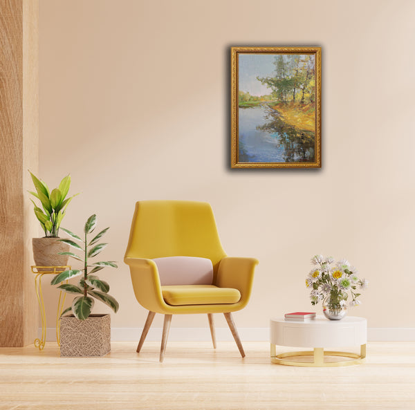 - "It is an atmospheric landscape capturing the serene moment after an autumn rain, when a rural path transforms into a shimmering, reflective pool. The water acts as a natural mirror, echoing the soft sky, scattered clouds, and the golden hues of the trees, creating a harmonious interplay of light and color.