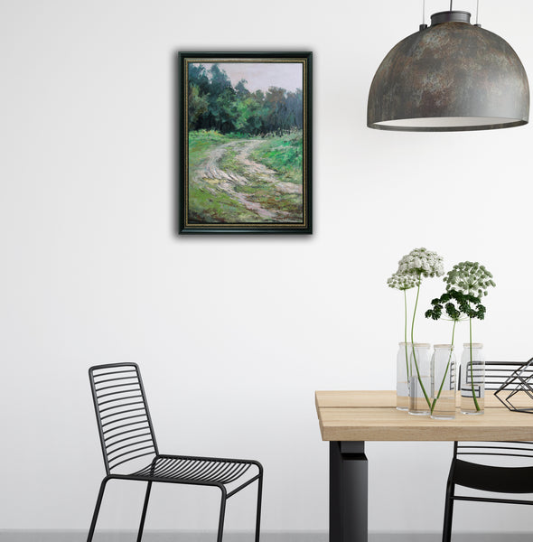 • "A country road leads into the park, toward the quiet mist that wraps the trees and grass like a gentle veil. The air is heavy with moisture and calm, and every curve of the road seems to slow down time. The painting radiates the melancholy, inviting reflection and quiet memory." Henadzy